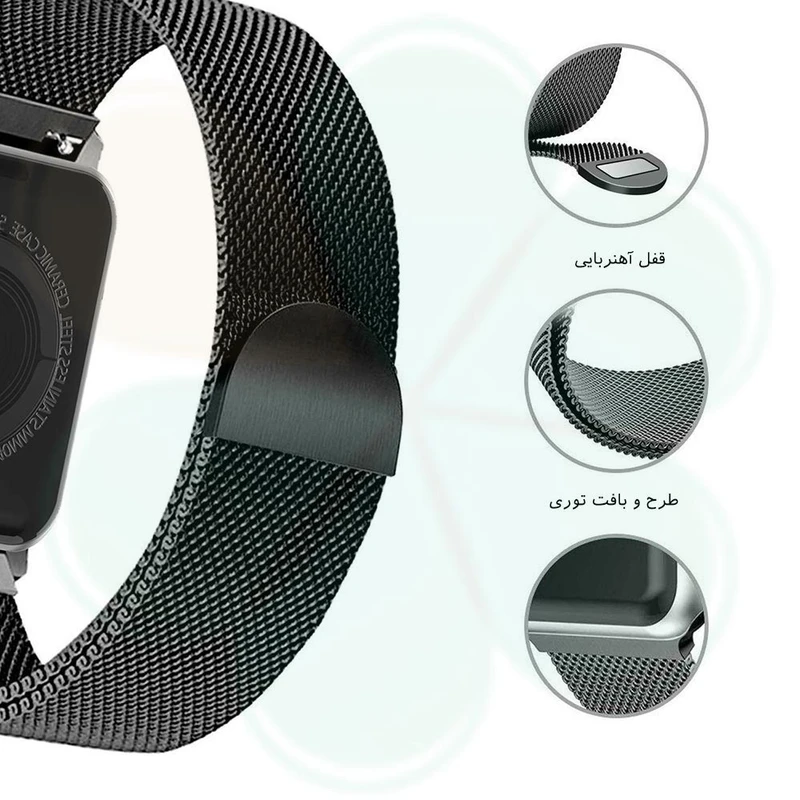 یکی از پرفروش ترین بندها که در اپل واچ و دیگر ساعت های هوشمند مورد استقبال قرار گرفته و مد ۲۰۲۳ است. تنوع رنگی که این محصول دارد به شما امکان ست کردن با استایل تان را می دهد. بند میلانس مگنتی برای باز و بسته شدن به دور مچ دست به راحتی انجام می شود. نیازی به قفل یا زنجیر برا بسته شدن ندارد و مگنت آن باکیفیت است و خیالتان از بابت کیفیت مگنت آسوده باشد