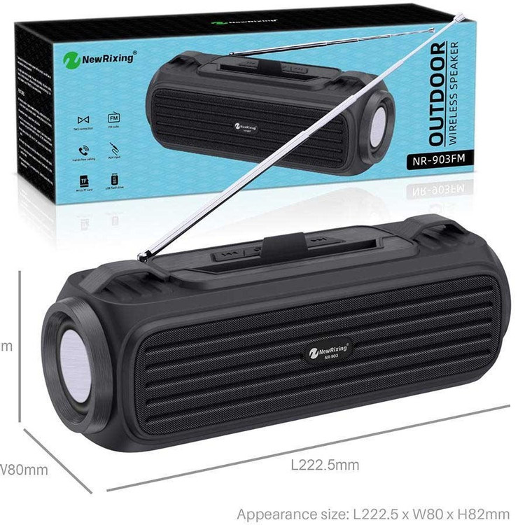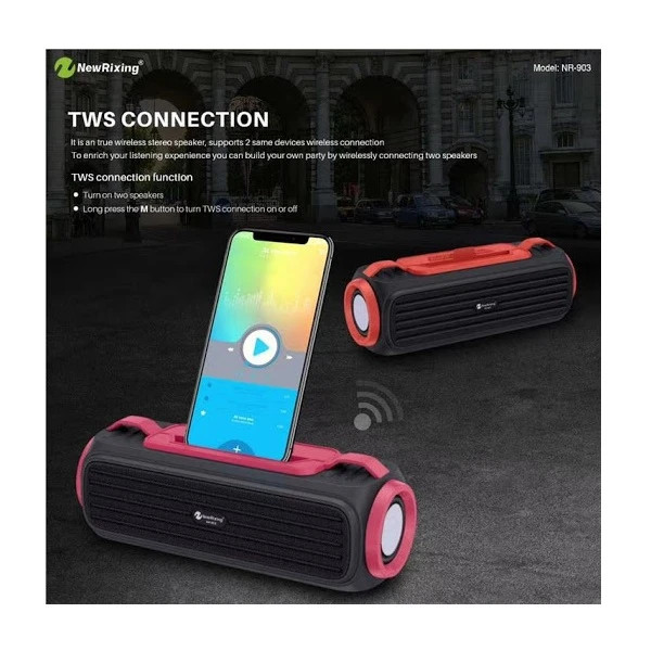 اسپیکر بلوتوثی مدل NR-903FM یکی از بهترین اسپیکرهایی است که صدای خروجی آن کیفیت بالایی داشته و یک باتری با ظرفیت 1200 میلی آمپر ساعت دارد. شما می توانید با استفاده از بلوتوٍث این اسپیکر را به تمام دستگاه های مجهز به بلوتوث متصل نمایید. همچنین در قسمت پشت این محصول شیار کارت حافظه،پورت USB و یک درگاه AUX وجود دارد که می توانید موبایل و سایر دستگاه های خود را توسط کابل AUX به آن وصل کرده، رم خود را در آن قرار دهید و یا فلش مموری خود را به آن متصل کنید. اگر یک اسپیکر با کیفیت و با دوام می خواهید که در گردش، منزل و… از آن استفاده کنید، این اسپیکر را به شما پیشنهاد می دهیم. پشتیبانی از رادیو و تکنولوژی TWS از دیگر ویژگی های این محصول است. تکنولوژی TWS به شما کمک می کند تا بتوانید علاوه بر این اسپیکر، موبایل خود را به دستگاه های مختلفی که این تکنولوژی را ساپورت می کنند، نیز وصل کنید. به عنوان مثال موبایل خود را به چند اسپیکر TWS متصل کنید. یک بند رو دوشس در کارتن این اسپیکر قرار دارد که می توانید برای حمل راحت، از آن استفاده کنید. همچنین میتوانید گوشی خود را در شیاری که در بالای اسپیکر قرار دارد بگذارید و از موزیک لذت ببرید.